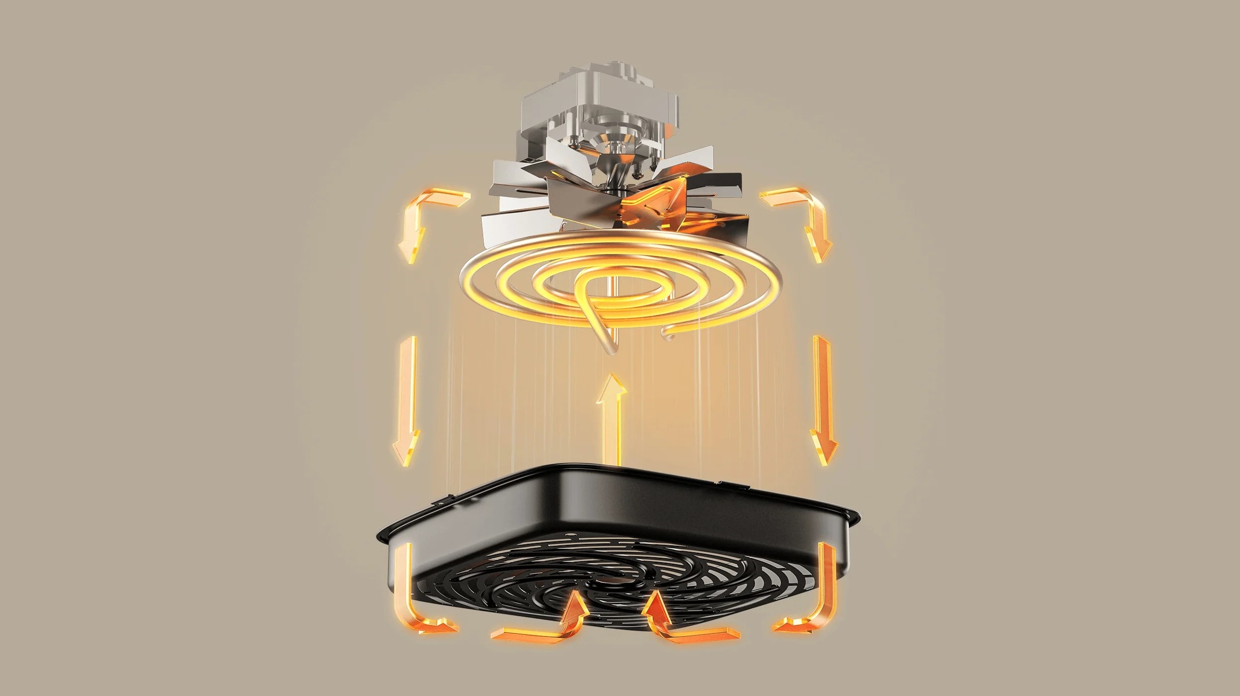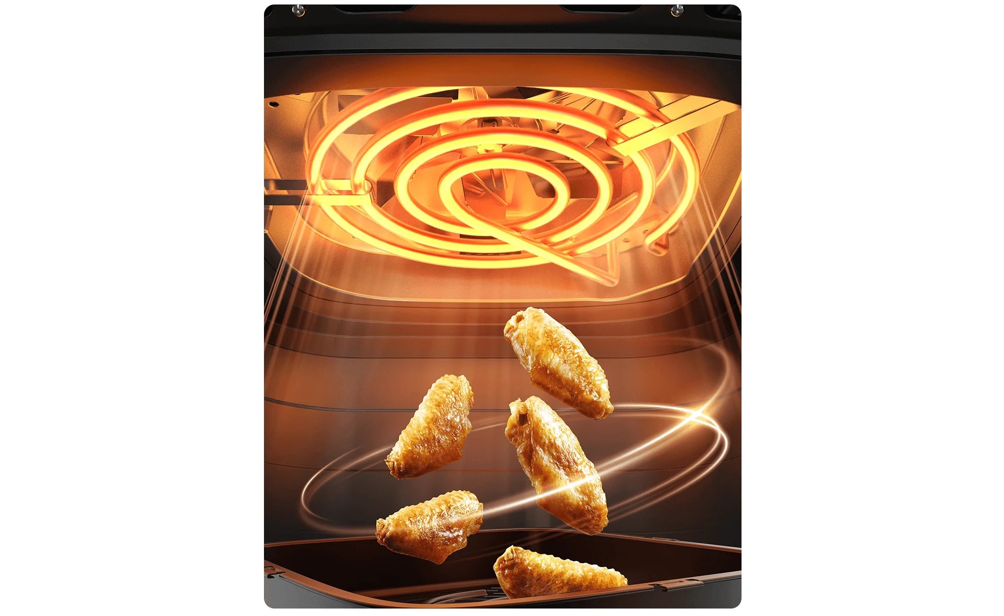 Двухреберные спиральные лопасти вентилятора и 3D циклонная жарочная поверхность обеспечивают конвекционный нагрев на 360° для равномерного приготовления пищи без необходимости переворачивания.