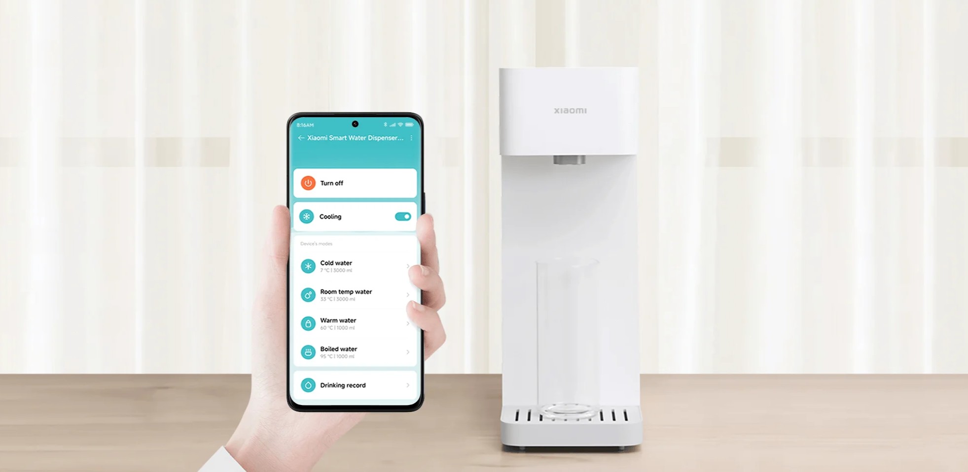 С помощью приложения Mi Home можно регулировать температуру воды дистанционно, вносить данные о выпитом количестве воды, включать и выключать диспенсер.