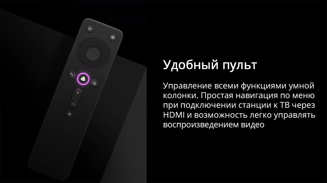 Пользоваться голосовым управлением удобно далеко не всегда. При использовании умной колонки в качестве медиаплеера может быть гораздо комфортнее управлять воспроизведением и выбирать контент с помощью пульта, а перекрикивать звуковые эффекты, чтобы изменить громкость, в таком случае не потребуется. Пульт оснащён микрофоном, с помощью которого можно тихо попросить Алису о чём-либо, не разбудив никого из домочадцев.